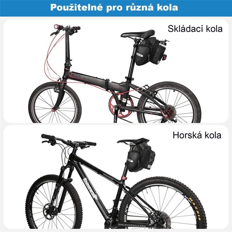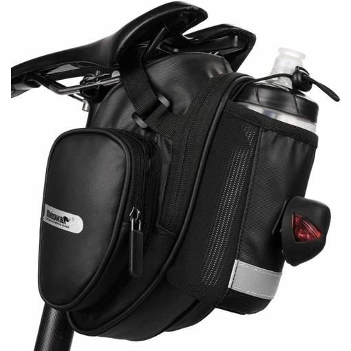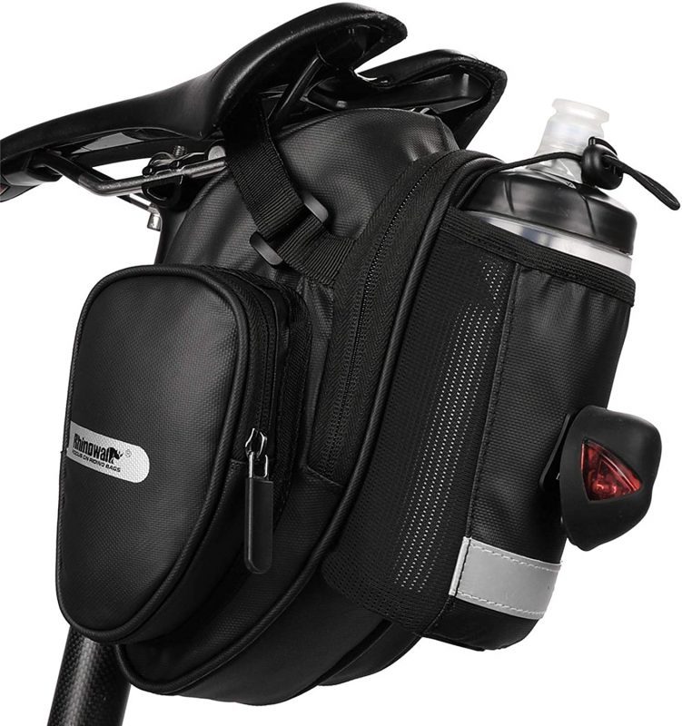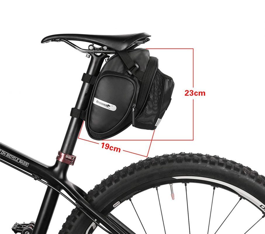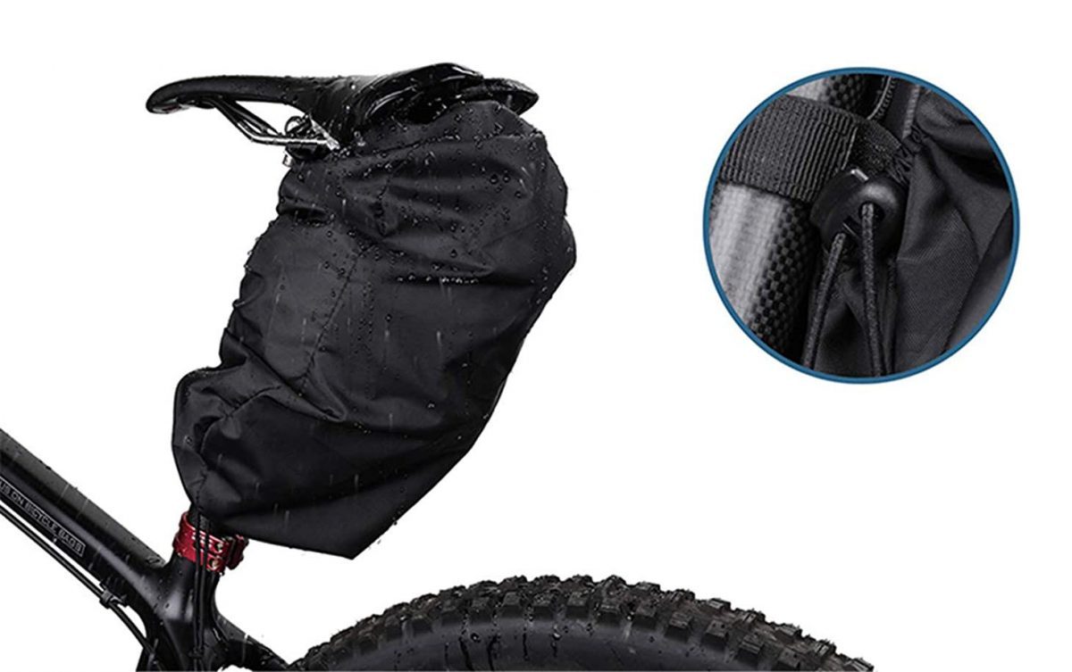 A vízhatlan táska a kerékpár ülésén sok zsebbel rendelkezik a kerékpáros felszerelésének rendszerezésére.