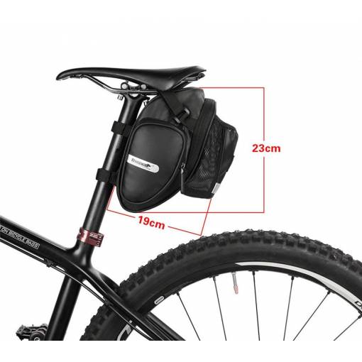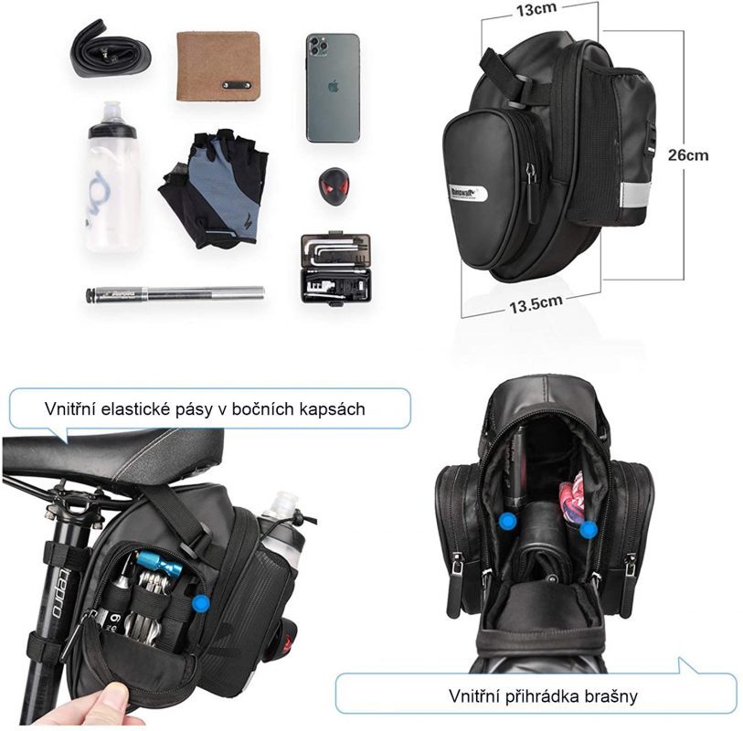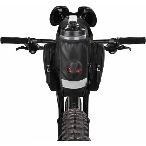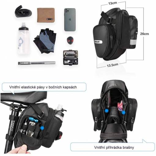 Mindkét oldalsó zsebben rugalmas pántok találhatóak a kerékpáros javítóeszközök átlátható tárolására stb. A hátsó zseb szorító zsákja megfelelő pl. a vízpalack elhelyezésére.