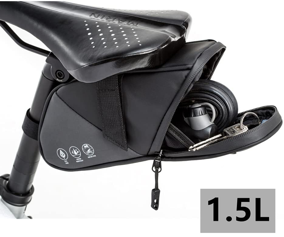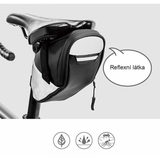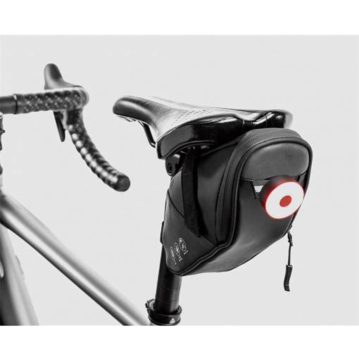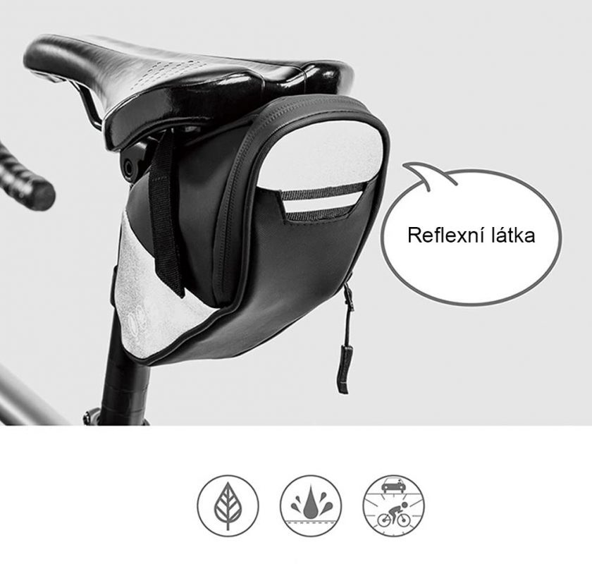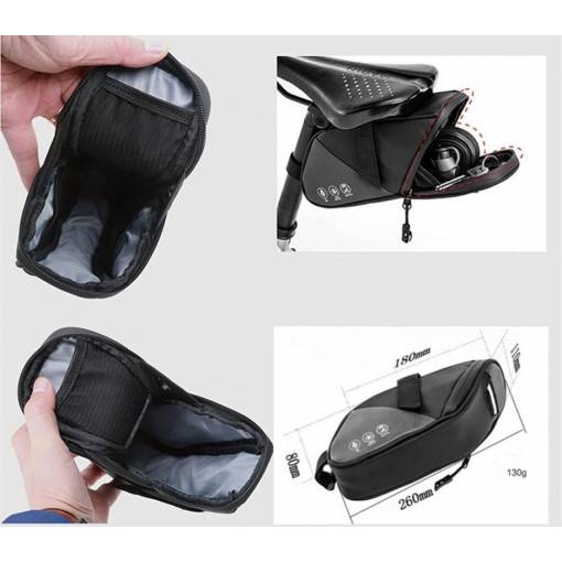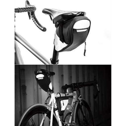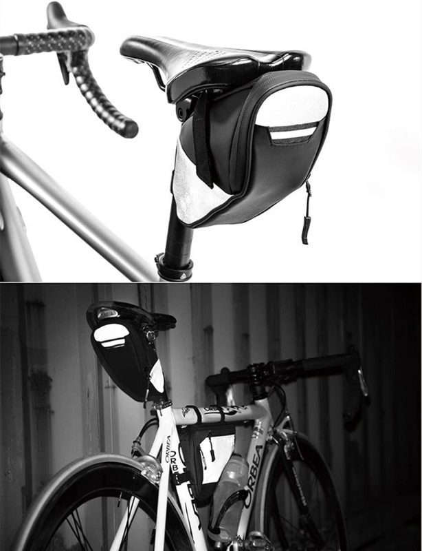 Reflexiós és biztonságos kerékpározás: a nyereg alatti táska reflexiós csíkkal javítja a láthatóságot az éjszakában, és biztosítja a biztonságos közlekedést, a táska hátsó oldalán lévő nyílások pedig lehetővé teszik a hátsó fény rögzítését a még nagyobb láthatóság érdekében.