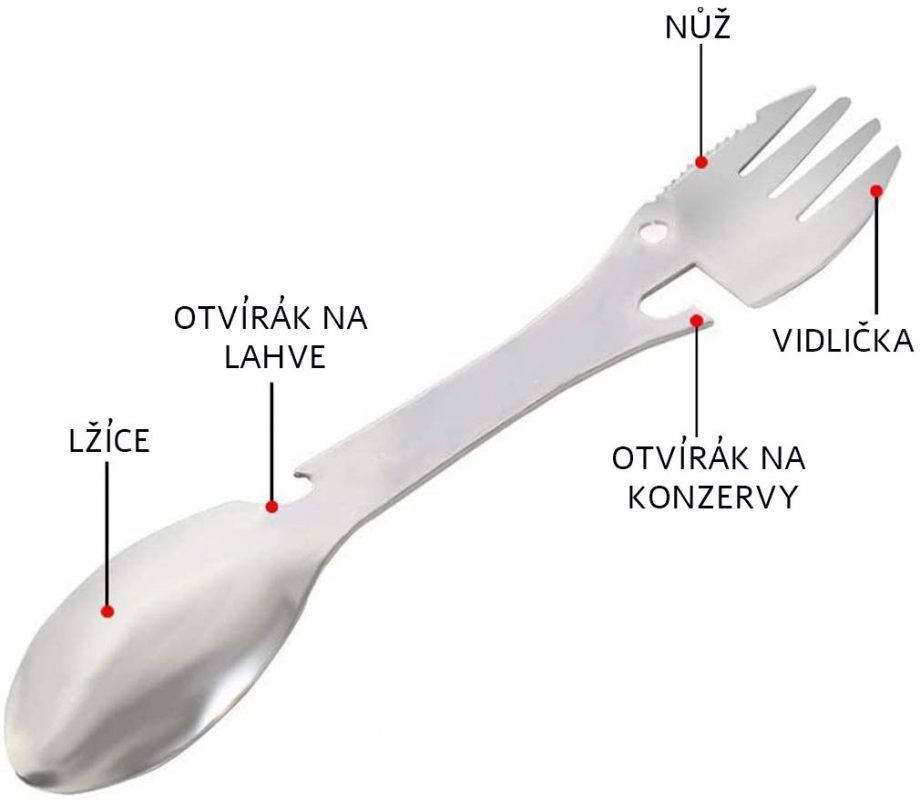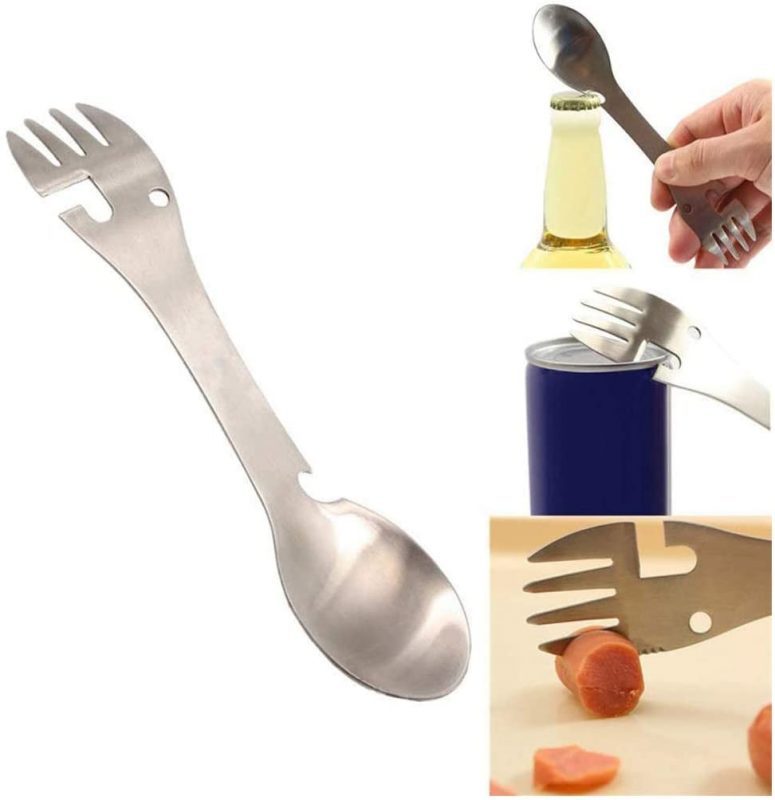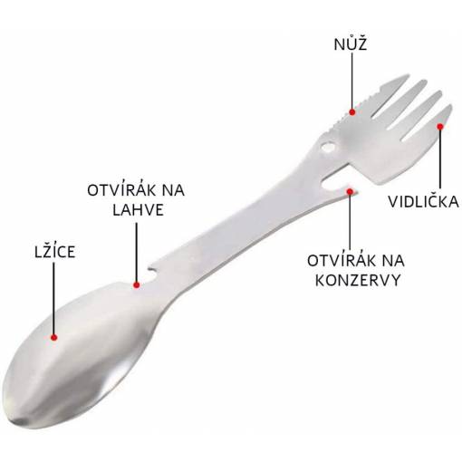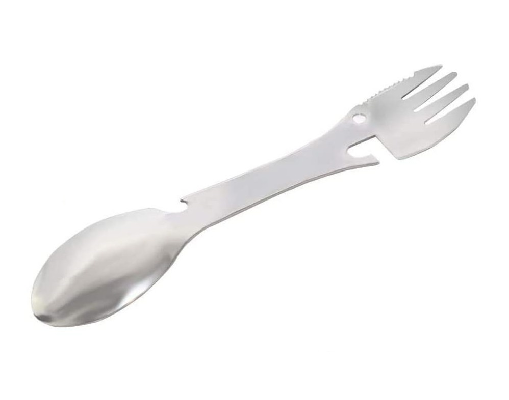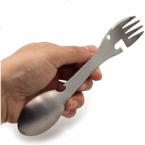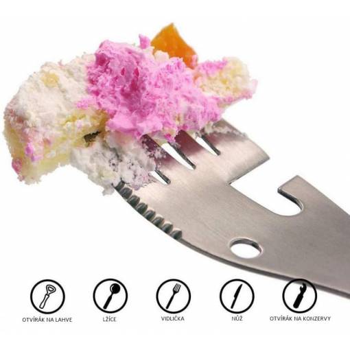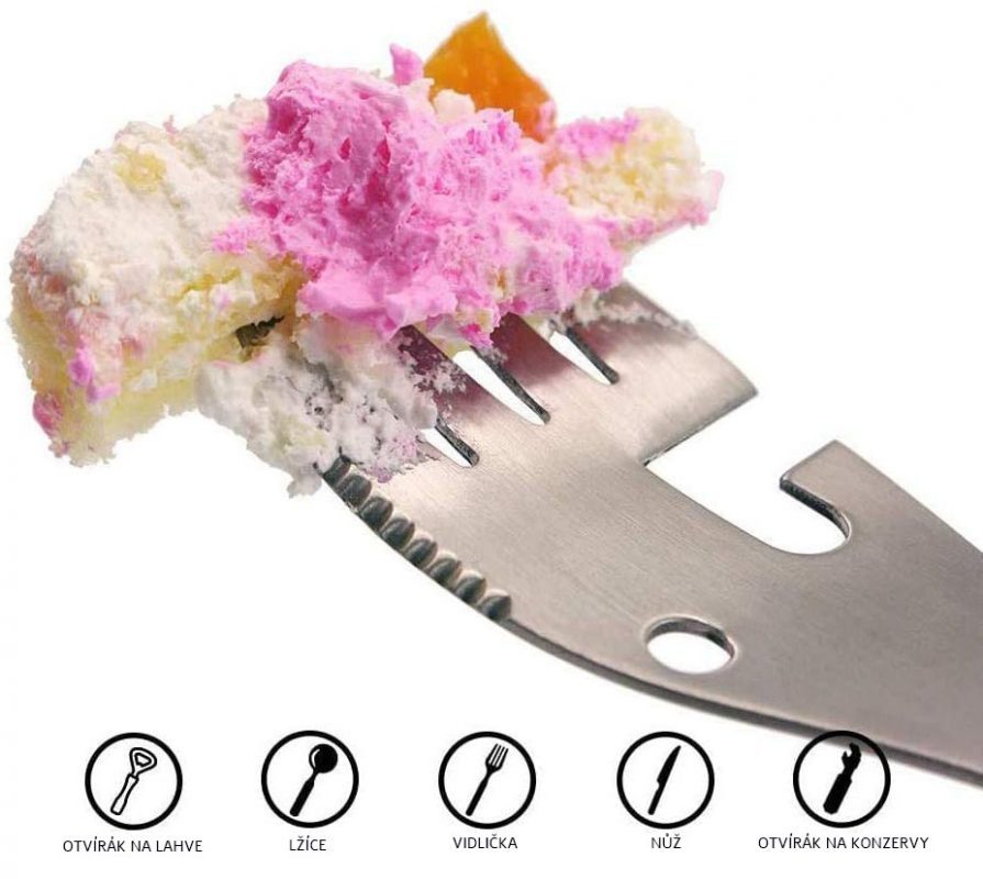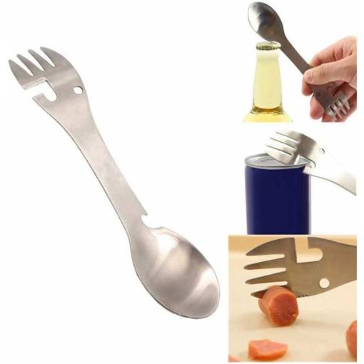 Ez a többfunkciós evőeszközkészlet teljes mértékben helyettesíti a kanalat, villát, kést, palacknyitót és konzervnyitót.