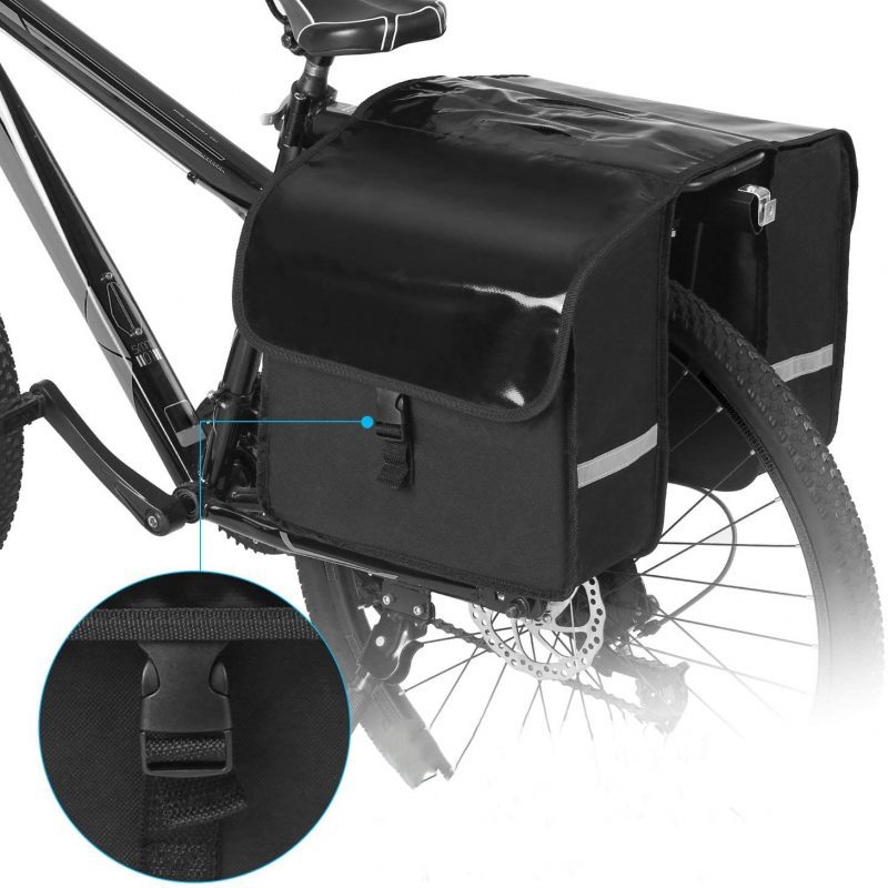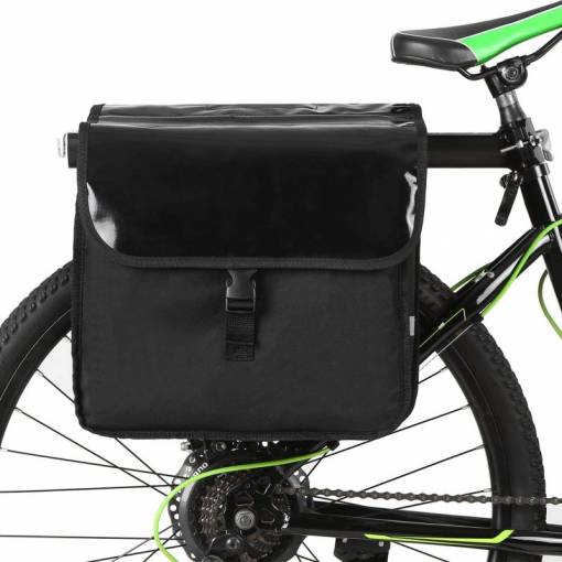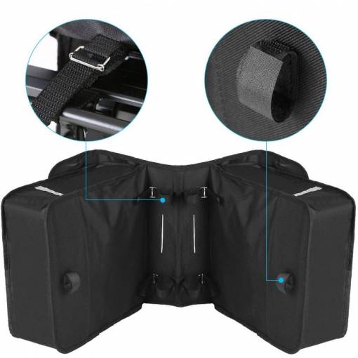 A tágas hátsó kerékpár túratáska két oldalsó zsebbel rendelkezik, gyorskioldókkal.