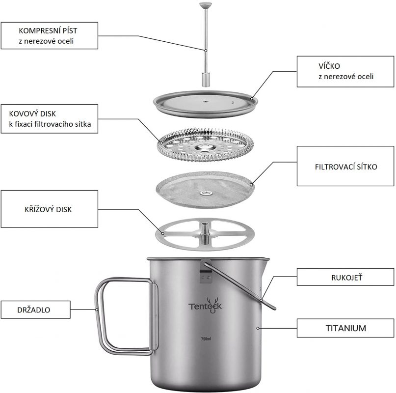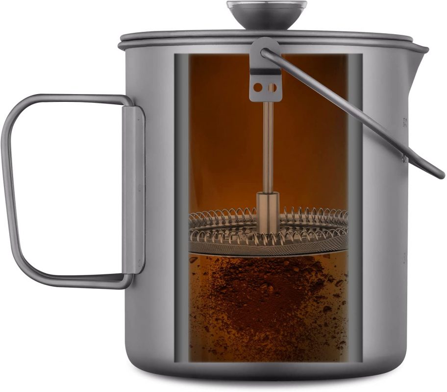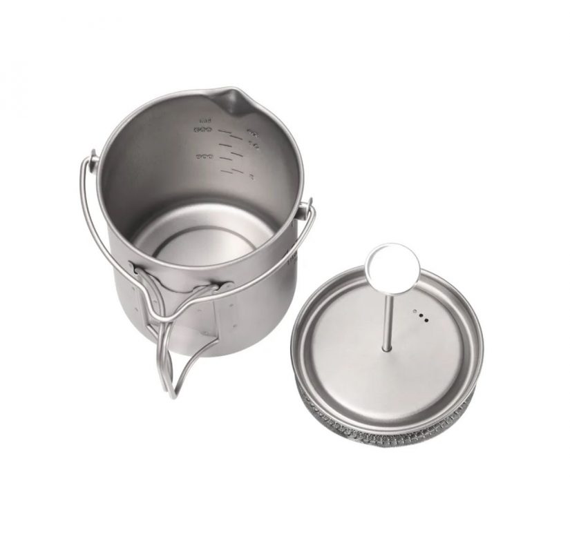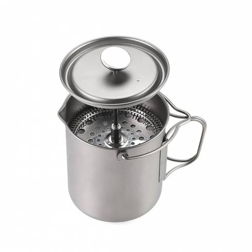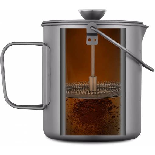 Kiváló minőségű kültéri French Press. Titánból készült, ezért ultrakönnyű, ugyanakkor tartós, környezetbarát, biokompatibilis, antibakteriális és biztonságos hosszú távú használatra.