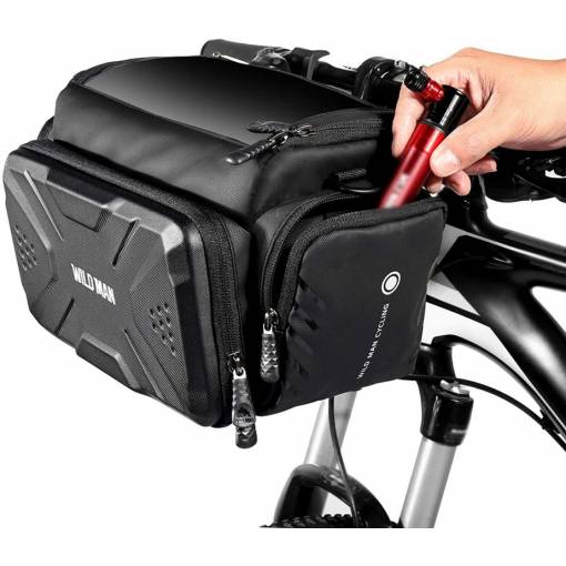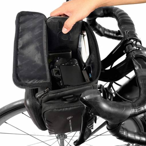 Terjedelmes kerékpáros táska 4 literes kapacitással. A nagyméretű fő rekesz és három kisebb, párnázott cipzáros zseb szisztematikusan tárolhatja a kerékpáros túrához szükséges összes eszközt.