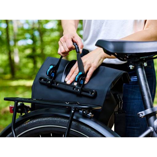 A QuickSafe rögzítőrendszer segítségével a táska könnyen rögzíthető a hátsó csomagtartóra és ugyanolyan könnyen eltávolítható.
