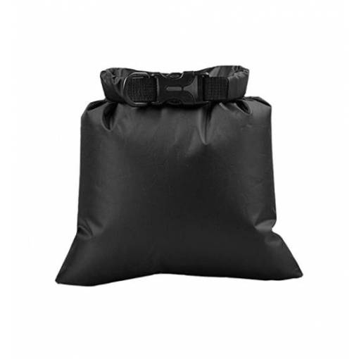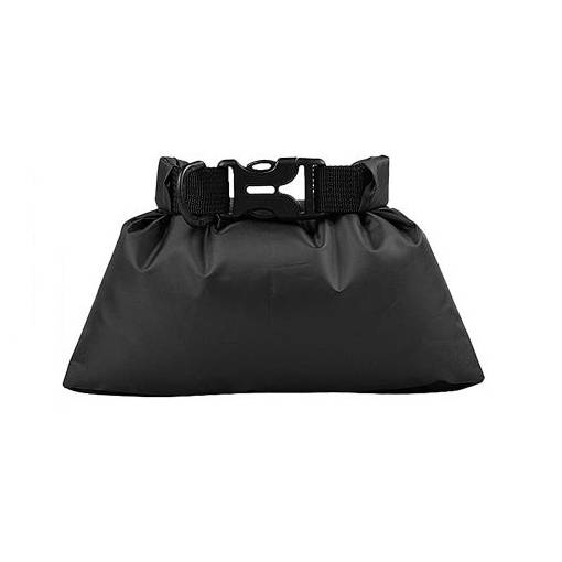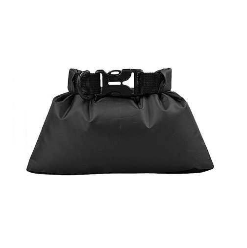 A táska lezárása a szél részének begöngyölésével és a heveder áthúzásával biztosítja a vízállóságot és a helytakarékos tárolást.