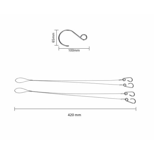 A csomag 2 darabot tartalmaz (mindegyik darab 2 kötelet egy hurokkal az egyik végén és 2 horgot a másikon) és egy nagy horgot.