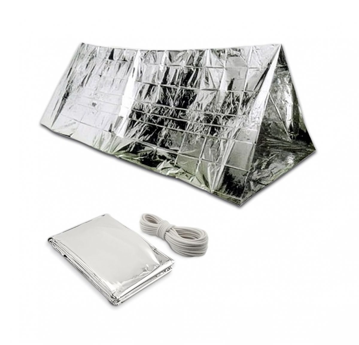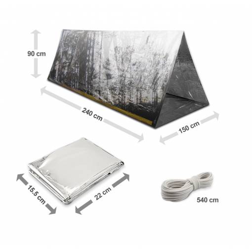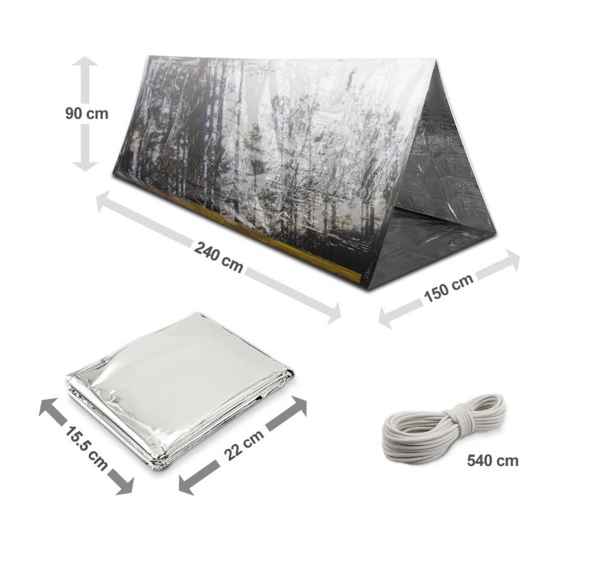A csomag tartalmaz egy sürgősségi bivak sátrat és a rögzítéshez szükséges zsinórt.