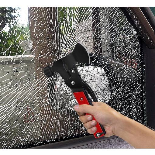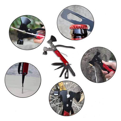 A multifunkcionális kültéri fejsze kalapáccsal, fogókkal, késsel, fűrésszel, csavarhúzóval, kulcsokkal, üvegnyitóval és számos más eszközzel ellátva, amelyek alkalmazhatóak a természetben való túléléshez,