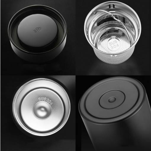 Praktikus szövetfüllel van ellátva, amely lehetővé teszi a kényelmes fogást, és levehető szűrővel az italokhoz. Ez is rozsdamentes acélból készült.
