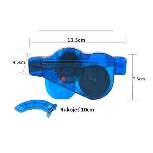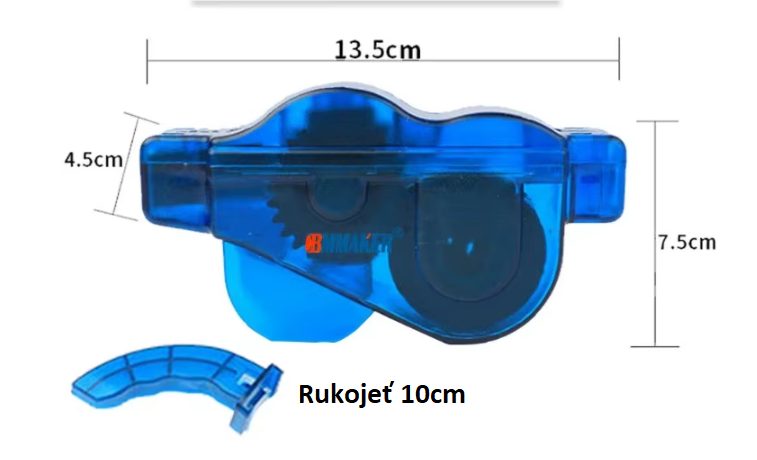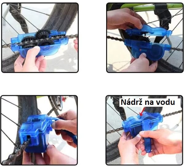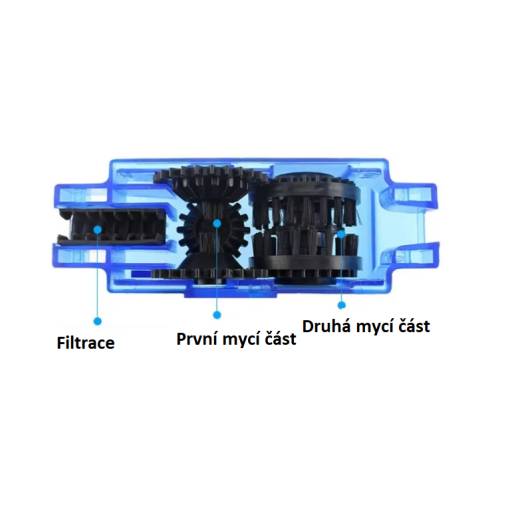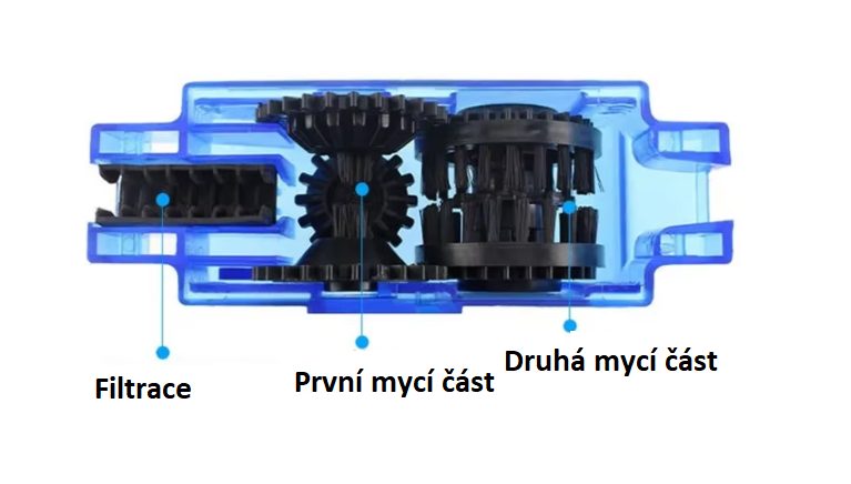 A tisztító két részből áll, amelyek a lánc körül nyílnak és záródnak. Nyitás után a láncot behelyezzük az alsó részbe, amely tisztítókeféket és vezetőhornyokat tartalmaz.