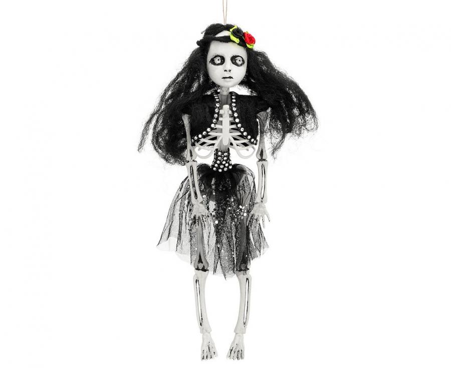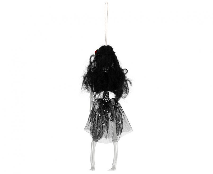 Teremtsd meg otthon a megfelelő ijesztő hangulatot az eredeti függő dekorációval. A figura fekete ruhát visel tüll szoknyával. A hajában színes virág található, ami különös és ijesztő megjelenést kölcsönöz a dekorációnak.