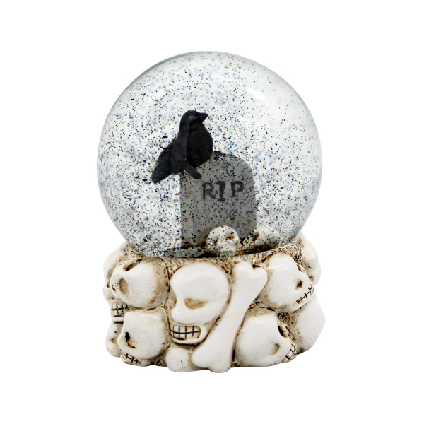 A fekete üvegből készült gömb hófújó hatást kelt, és a forgatás során belső fénye a halloweeni hangulatot teremti.